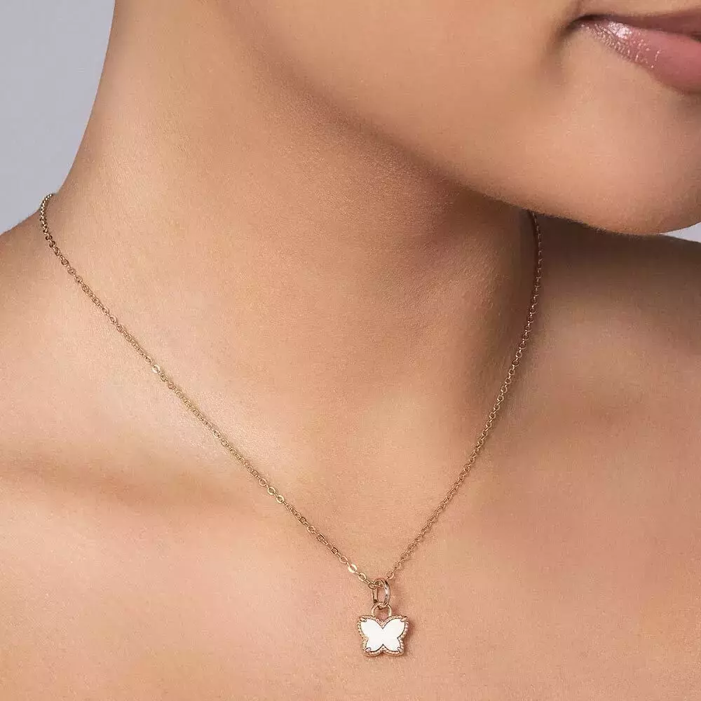Este delicado pingente Rommanel folheado a ouro traz um design encantador em formato de borboleta com detalhe em acrílico branco brilhante, perfeito para quem busca uma joia elegante e versátil.